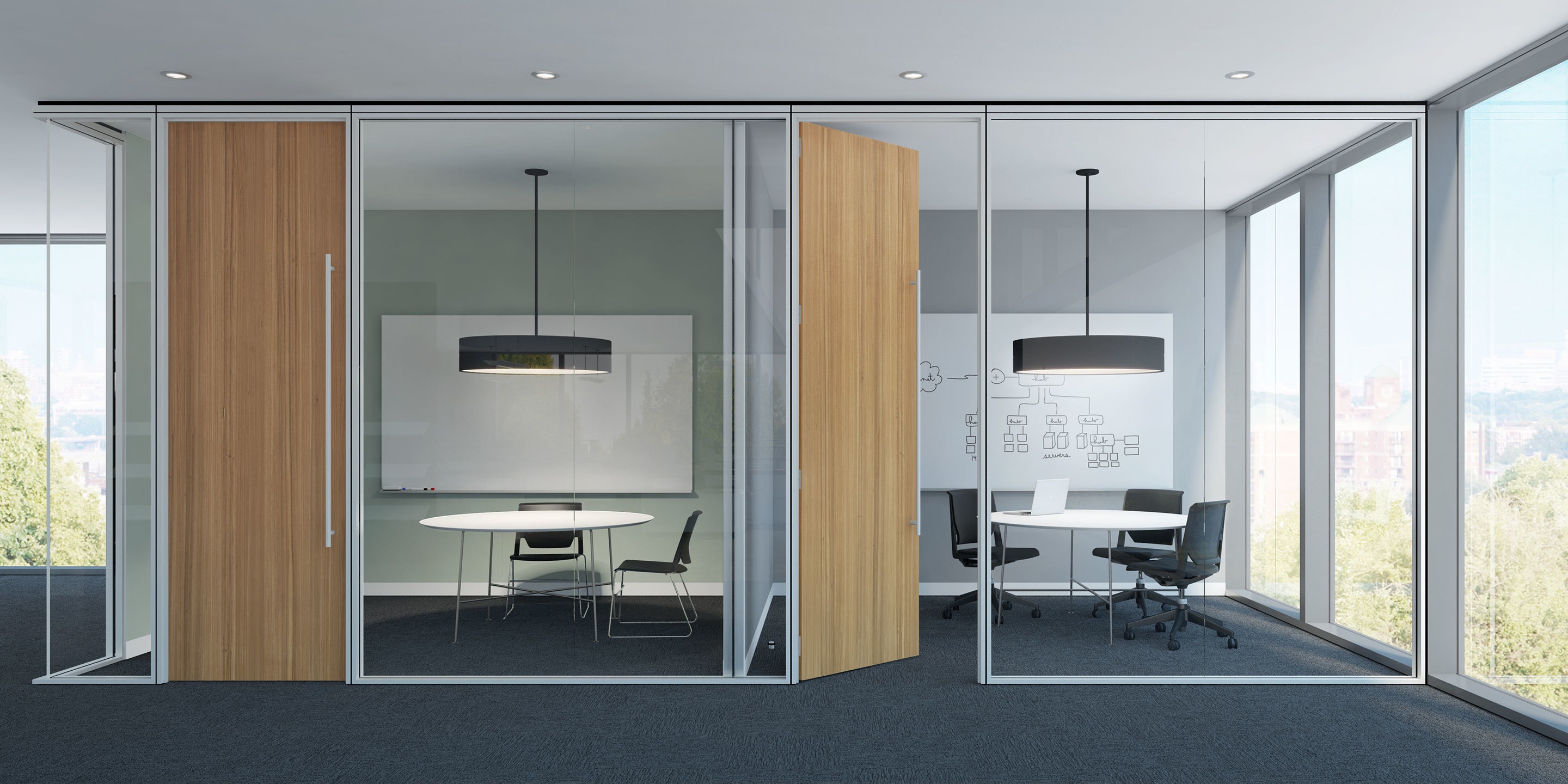 This system is perfect for areas where visual connection and light are prioritized over complete acoustic privacy: